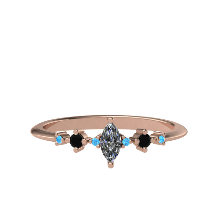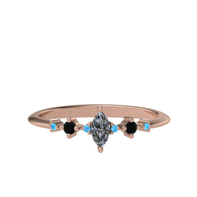Beyaz zirkon, siyah zirkon ve akuamarin 14 ayar rose altın yüzük