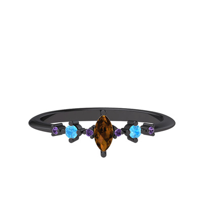 Dumanlı kuvars, akuamarin ve ametist 925 ayar siyah rodyum kaplama gümüş yüzük