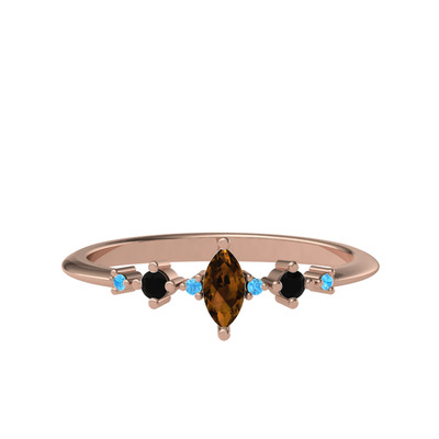Dumanlı kuvars, siyah zirkon ve akuamarin 18 ayar rose altın yüzük