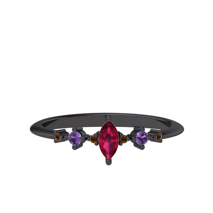 Rodolit garnet, ametist ve dumanlı kuvars 925 ayar siyah rodyum kaplama gümüş yüzük