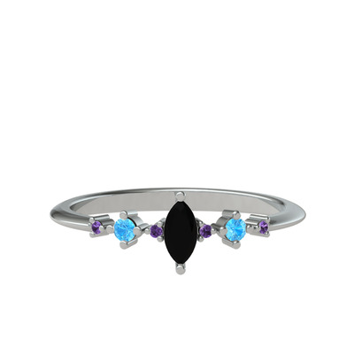Siyah zirkon, akuamarin ve ametist 18 ayar beyaz altın yüzük