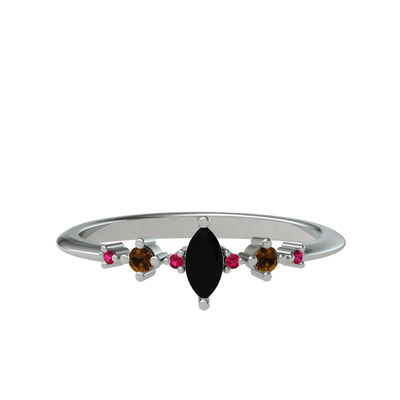 Siyah zirkon, dumanlı kuvars ve rodolit garnet 14 ayar beyaz altın yüzük