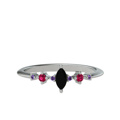 Siyah zirkon, rodolit garnet ve ametist 18 ayar beyaz altın yüzük