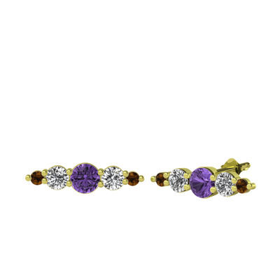 Ametist, swarovski ve dumanlı kuvars 8 ayar altın küpe