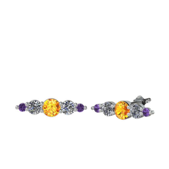 Sitrin, pırlanta ve ametist 8 ayar beyaz altın küpe (0.12 karat)
