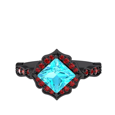 Akuamarin ve garnet 925 ayar siyah rodyum kaplama gümüş yüzük