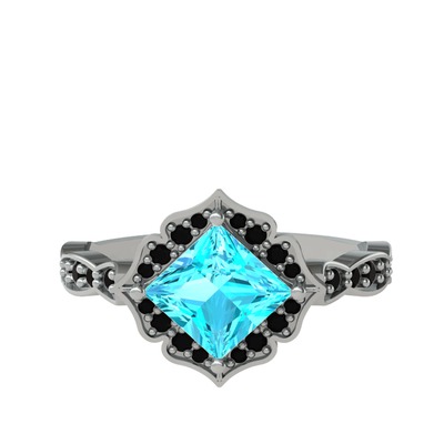 Akuamarin ve siyah zirkon 14 ayar beyaz altın yüzük