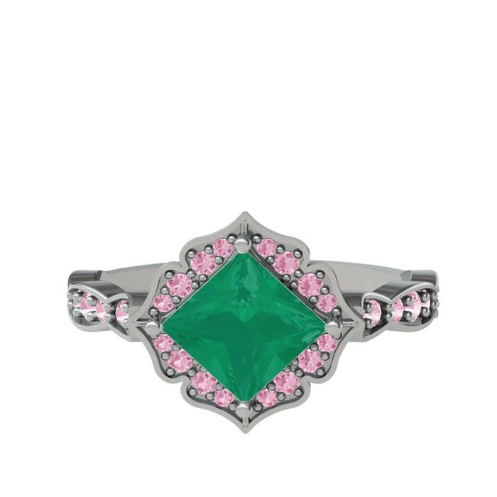 Kök zümrüt ve pembe kuvars 8 ayar beyaz altın yüzük