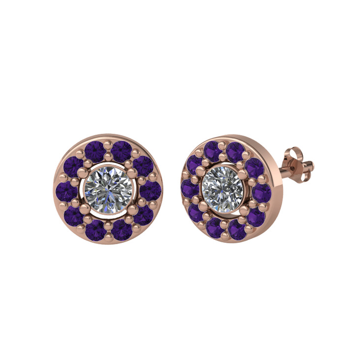 Pırlanta ve ametist 925 ayar rose altın kaplama gümüş küpe (1 karat)
