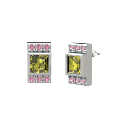 Peridot ve pembe kuvars 18 ayar beyaz altın küpe