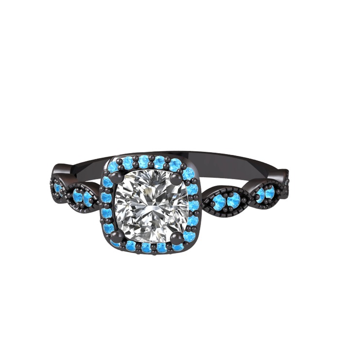 Pırlanta ve akuamarin 925 ayar siyah rodyum kaplama gümüş yüzük (0.92 karat)