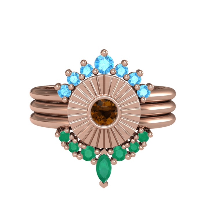 Akuamarin, dumanlı kuvars ve kök zümrüt 14 ayar rose altın yüzük