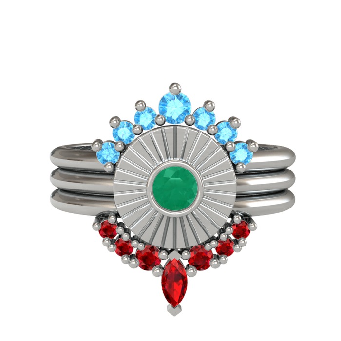 Akuamarin, kök zümrüt ve garnet 18 ayar beyaz altın yüzük