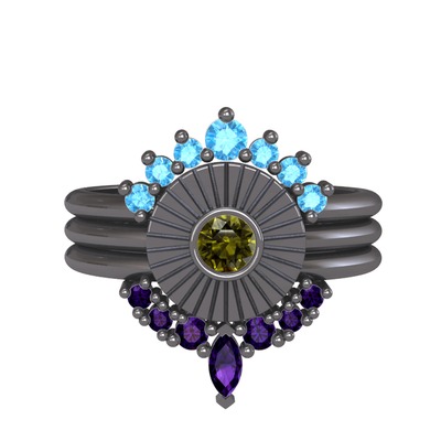 Akuamarin, peridot ve ametist 925 ayar siyah rodyum kaplama gümüş yüzük