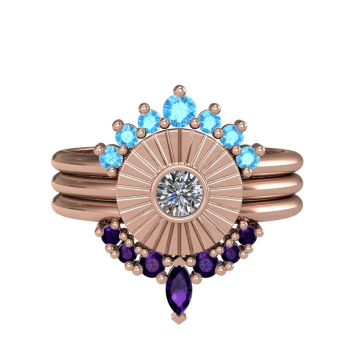 Akuamarin, pırlanta ve ametist 925 ayar rose altın kaplama gümüş yüzük (0.16 karat)