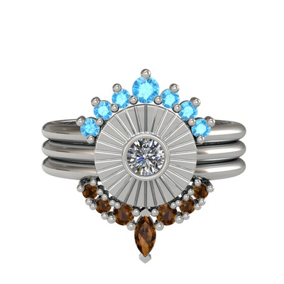 Akuamarin, pırlanta ve dumanlı kuvars 14 ayar beyaz altın yüzük (0.16 karat)