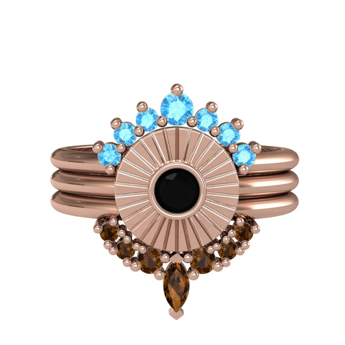 Akuamarin, siyah zirkon ve dumanlı kuvars 14 ayar rose altın yüzük