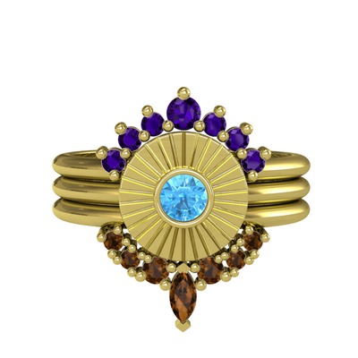 Ametist, akuamarin ve dumanlı kuvars 14 ayar altın yüzük