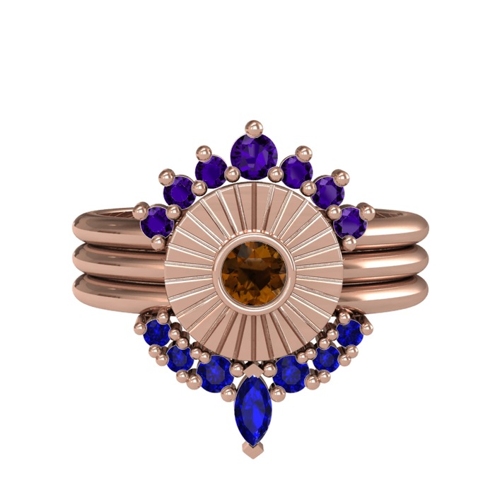 Ametist, dumanlı kuvars ve lab safir 18 ayar rose altın yüzük