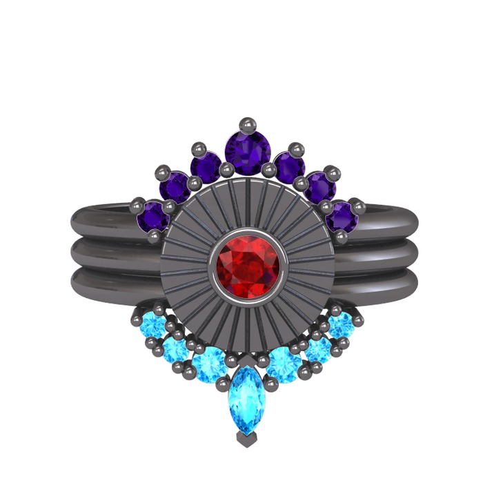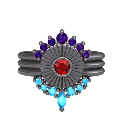 Ametist, garnet ve akuamarin 925 ayar siyah rodyum kaplama gümüş yüzük