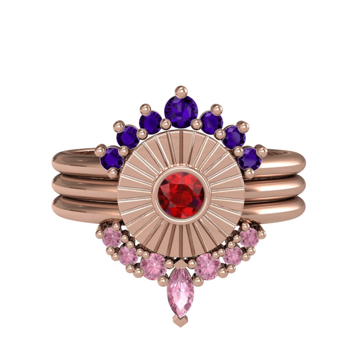 Ametist, garnet ve pembe kuvars 18 ayar rose altın yüzük
