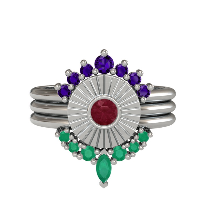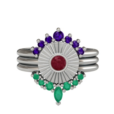 Ametist, kök yakut ve kök zümrüt 18 ayar beyaz altın yüzük