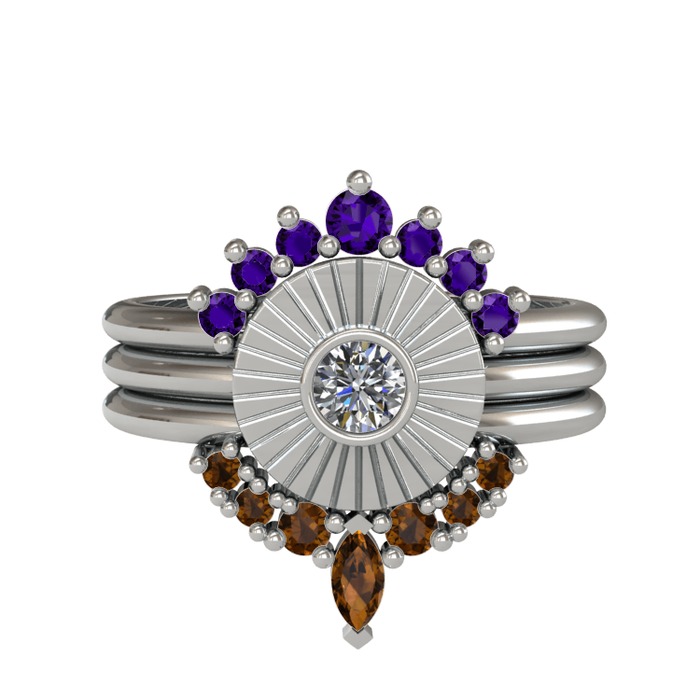Ametist, pırlanta ve dumanlı kuvars 18 ayar beyaz altın yüzük (0.16 karat)