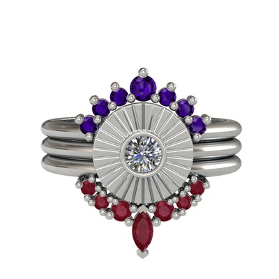 Ametist, pırlanta ve kök yakut 18 ayar beyaz altın yüzük (0.16 karat)