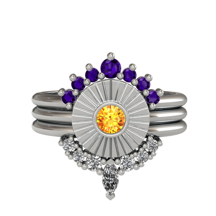 Ametist, sitrin ve beyaz zirkon 14 ayar beyaz altın yüzük