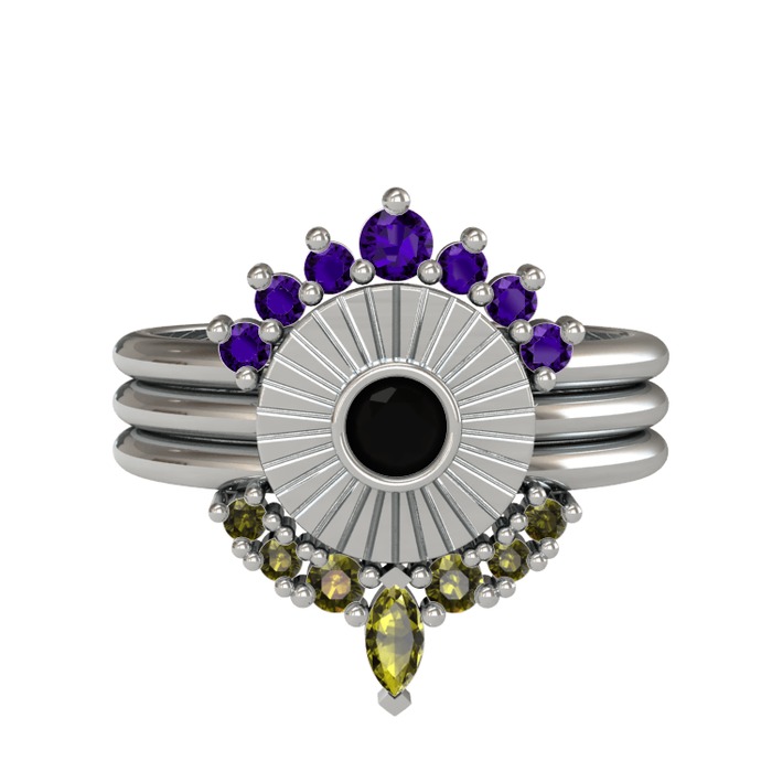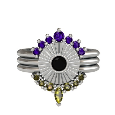 Ametist, siyah zirkon ve peridot 8 ayar beyaz altın yüzük