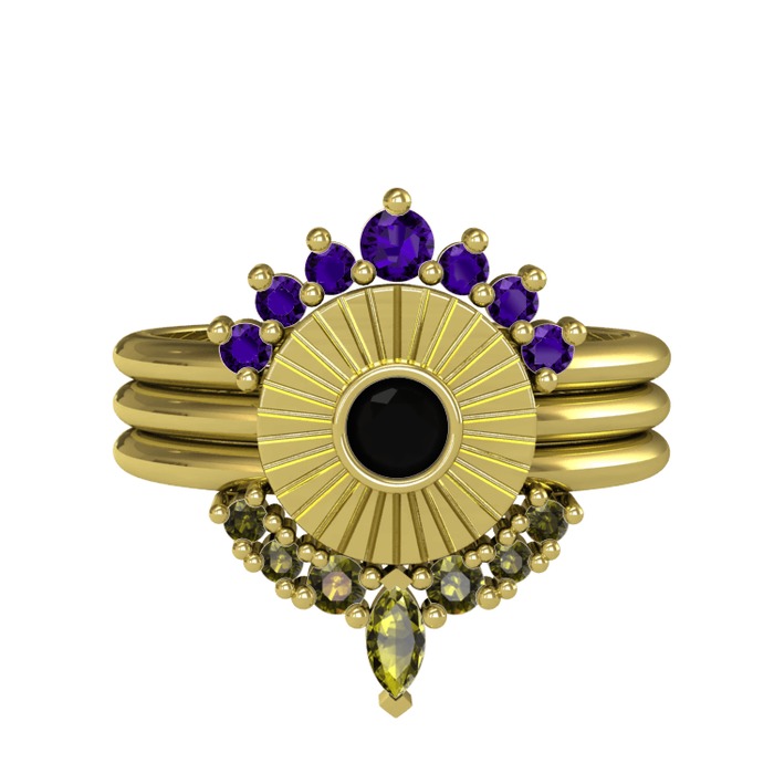 Ametist, siyah zirkon ve peridot 925 ayar altın kaplama gümüş yüzük