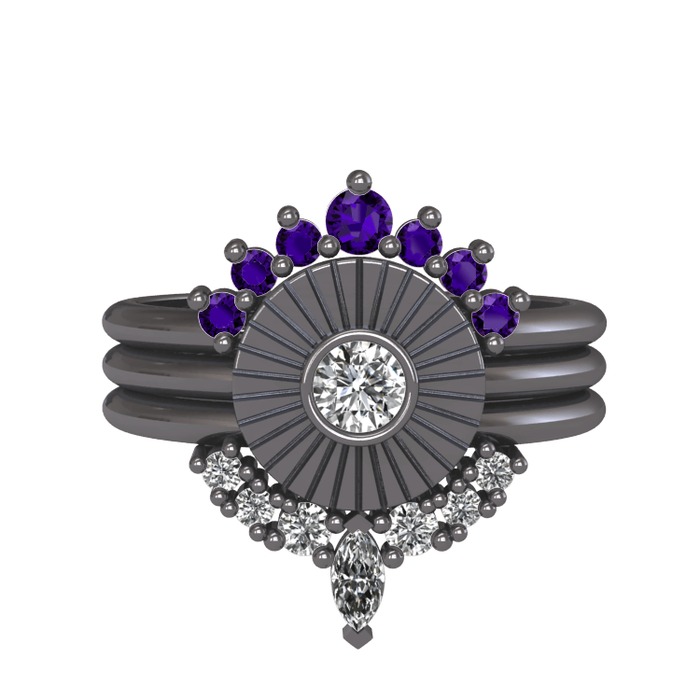 Ametist, swarovski ve beyaz zirkon 925 ayar siyah rodyum kaplama gümüş yüzük