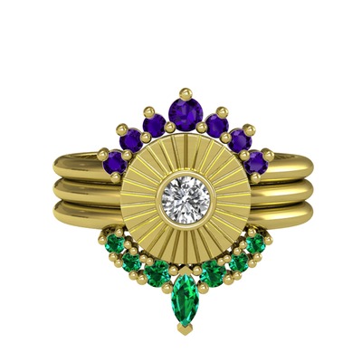 Ametist, swarovski ve yeşil kuvars 925 ayar altın kaplama gümüş yüzük