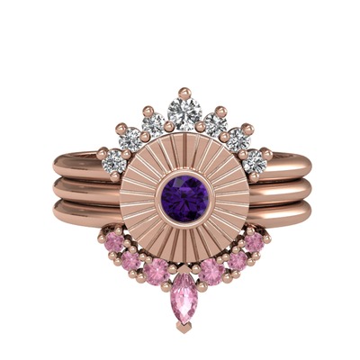 Beyaz zirkon, ametist ve pembe kuvars 8 ayar rose altın yüzük
