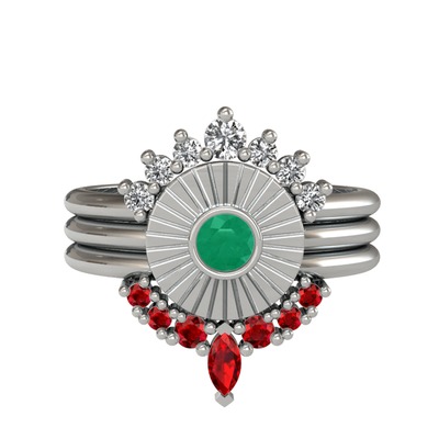 Beyaz zirkon, kök zümrüt ve garnet 18 ayar beyaz altın yüzük