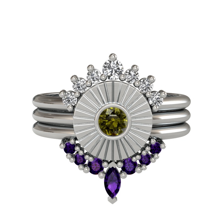 Beyaz zirkon, peridot ve ametist 8 ayar beyaz altın yüzük