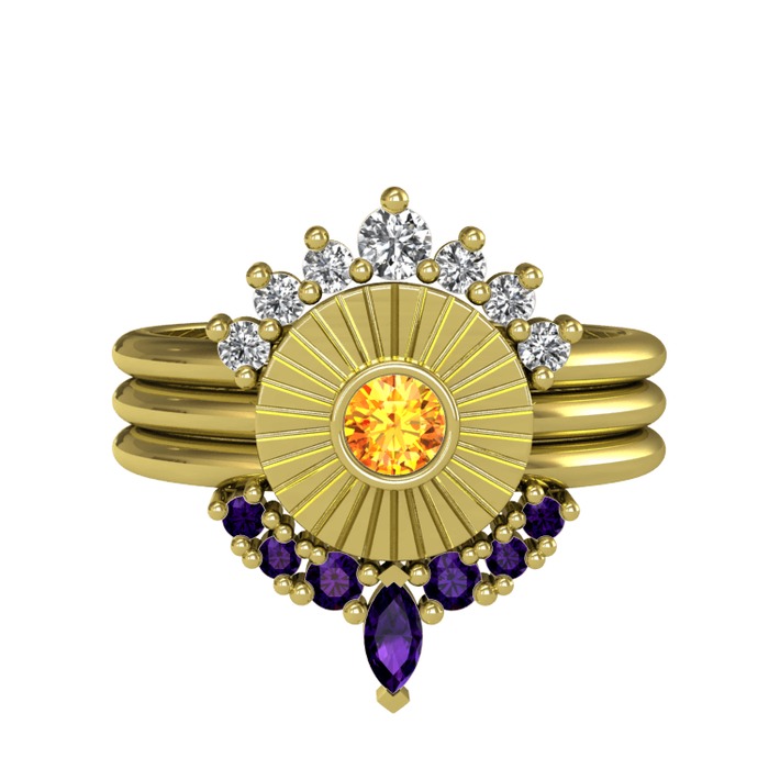 Beyaz zirkon, sitrin ve ametist 925 ayar altın kaplama gümüş yüzük