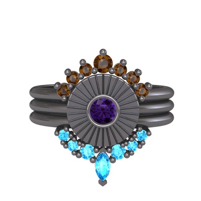 Dumanlı kuvars, ametist ve akuamarin 925 ayar siyah rodyum kaplama gümüş yüzük