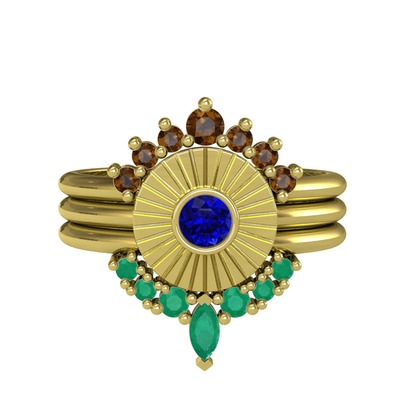 Dumanlı kuvars, lab safir ve kök zümrüt 925 ayar altın kaplama gümüş yüzük