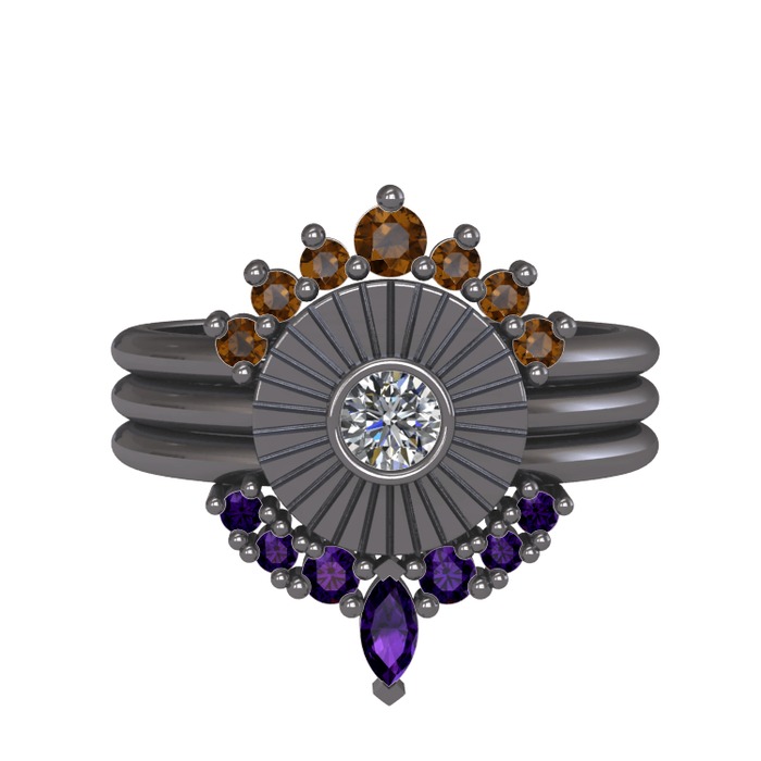 Dumanlı kuvars, pırlanta ve ametist 925 ayar siyah rodyum kaplama gümüş yüzük (0.16 karat)