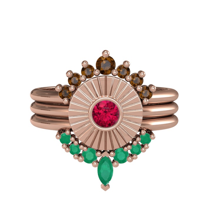 Dumanlı kuvars, rodolit garnet ve kök zümrüt 8 ayar rose altın yüzük