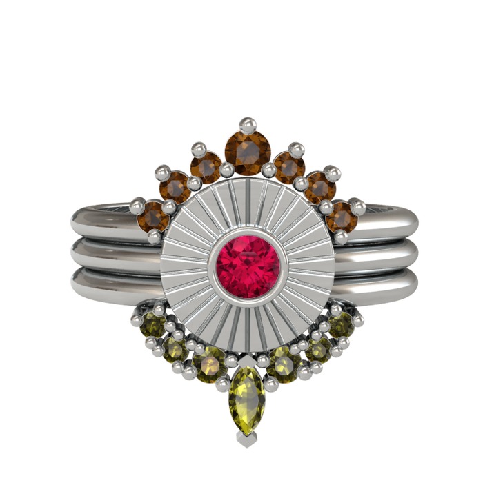 Dumanlı kuvars, rodolit garnet ve peridot 18 ayar beyaz altın yüzük