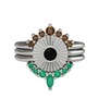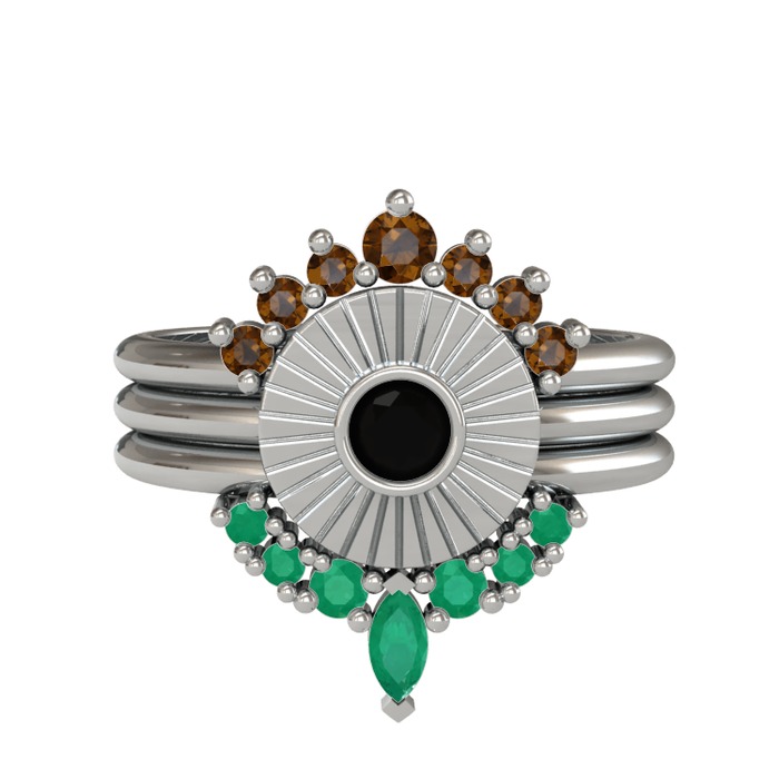 Dumanlı kuvars, siyah zirkon ve kök zümrüt 14 ayar beyaz altın yüzük