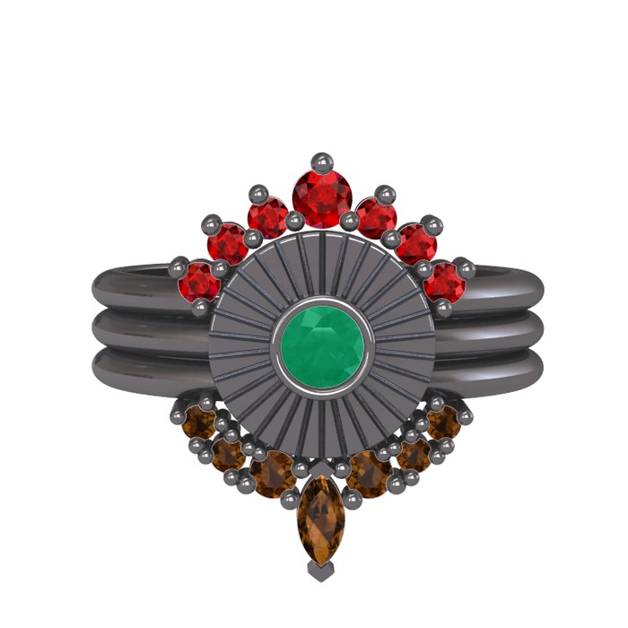 Garnet, kök zümrüt ve dumanlı kuvars 925 ayar siyah rodyum kaplama gümüş yüzük