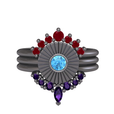 Kök yakut, akuamarin ve ametist 925 ayar siyah rodyum kaplama gümüş yüzük