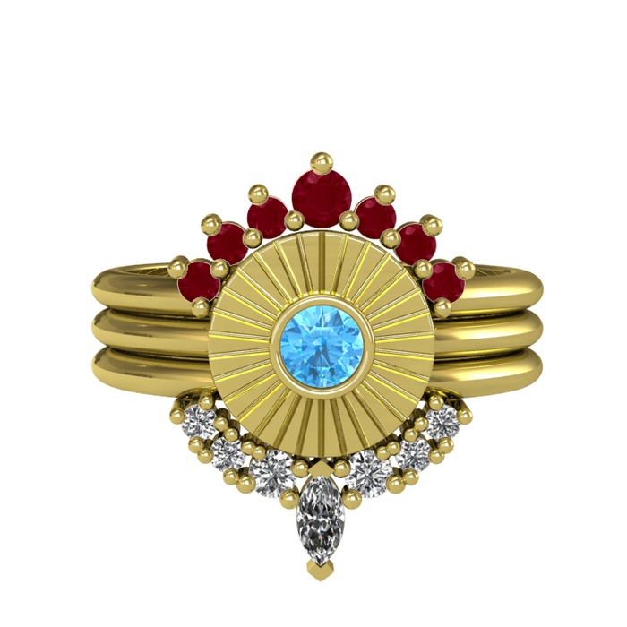 Kök yakut, akuamarin ve beyaz zirkon 18 ayar altın yüzük