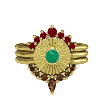 Kök yakut, kök zümrüt ve dumanlı kuvars 18 ayar altın yüzük