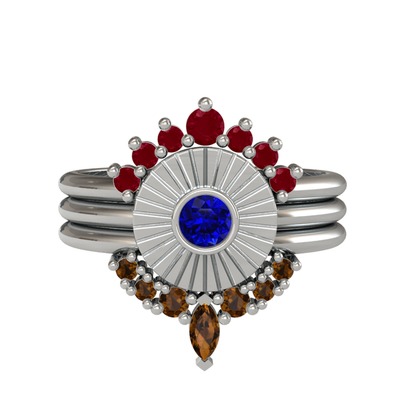 Kök yakut, lab safir ve dumanlı kuvars 18 ayar beyaz altın yüzük