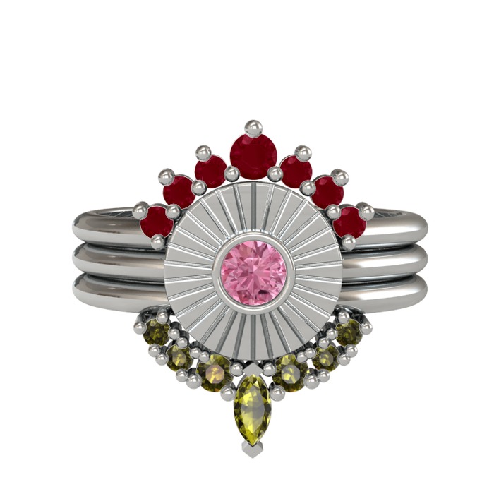 Kök yakut, pembe kuvars ve peridot 8 ayar beyaz altın yüzük