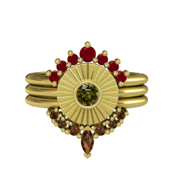 Kök yakut, peridot ve dumanlı kuvars 8 ayar altın yüzük